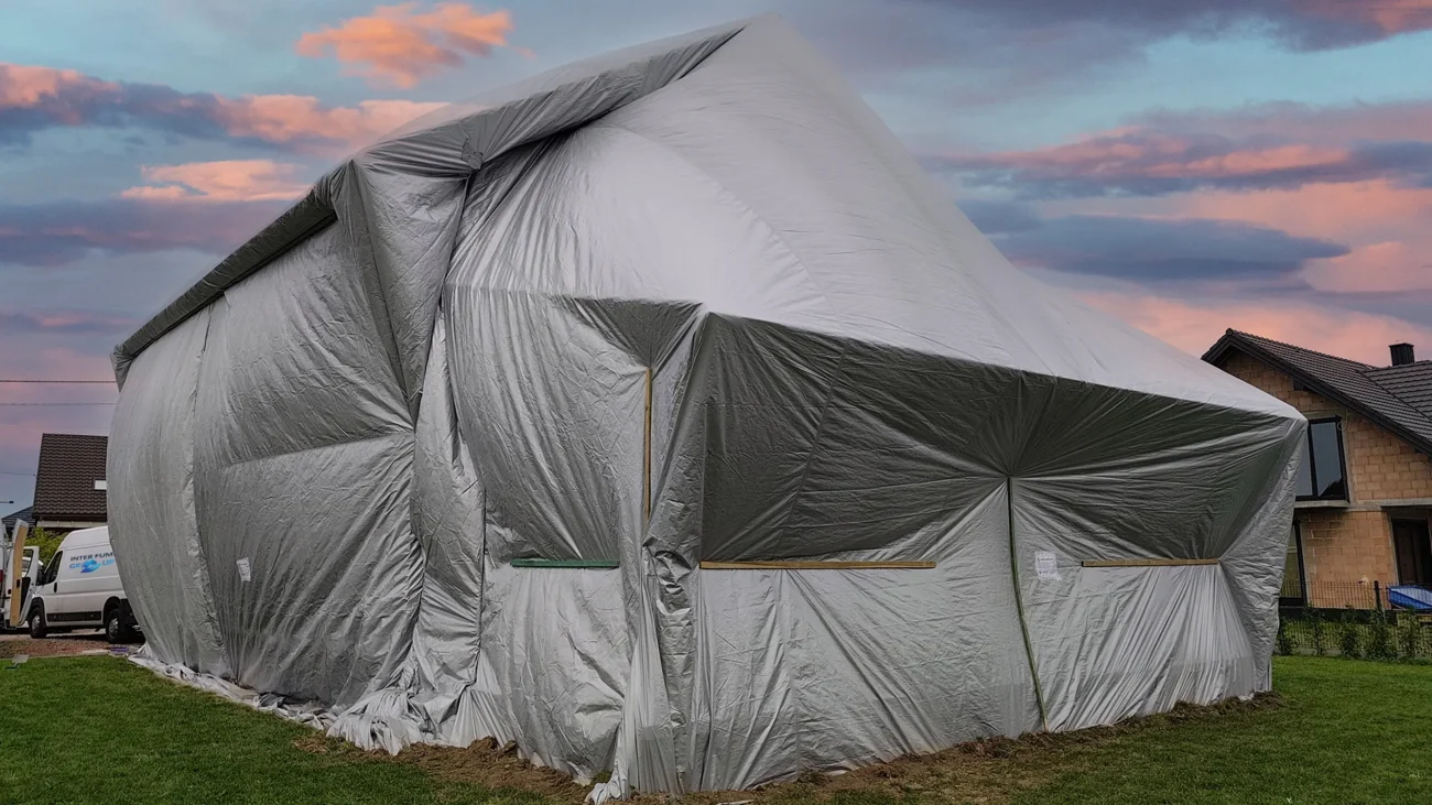 - Przygotowanie budynku – dom zostaje uszczelniony folią gazoszczelną, aby gaz pozostał wewnątrz. Mieszkańcy, zwierzęta i rośliny muszą opuścić obiekt.